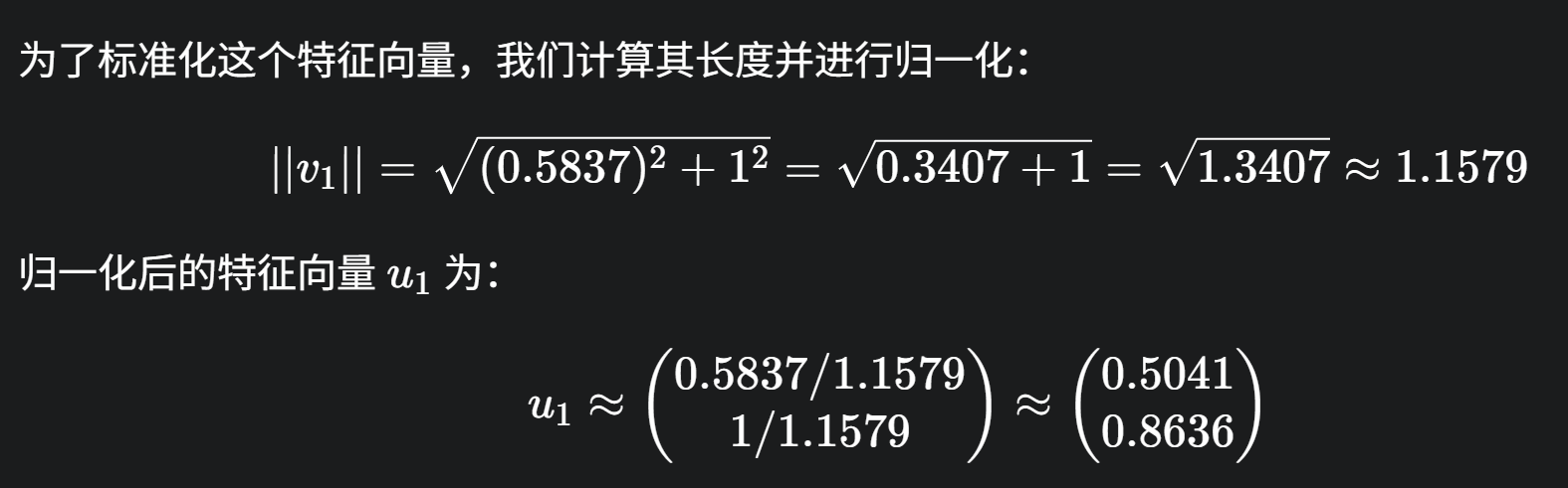 如果我们令 v2=1,那么 v1≈0.5837。所以,对应于 λ1 的特征向量 v1 大致为: